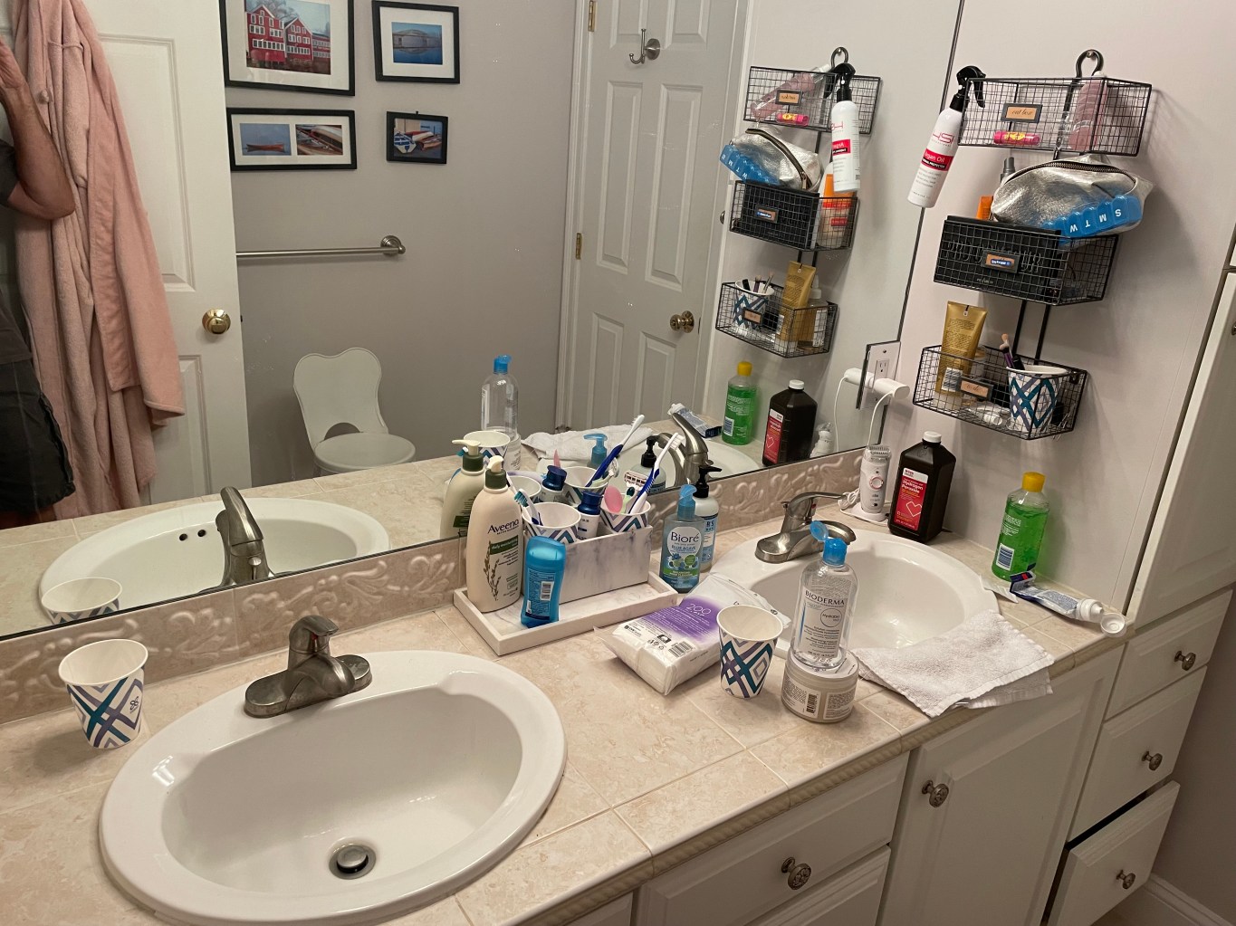This image is an example of our best case scenario from a neatness perspective. The sink on the left is (My Side) vs the sink on the right side (Her Side). Between the sink and the shower our shared spaces are filled with enough “product” to stock a cosmetic warehouse. I understand the need for the basics i.e soap, water, deodorant and toothpaste but beyond those standards, I get lost. Any help understanding more in this area is welcome… My side has a paper cup. Her side looks like an autobody shop for humans.